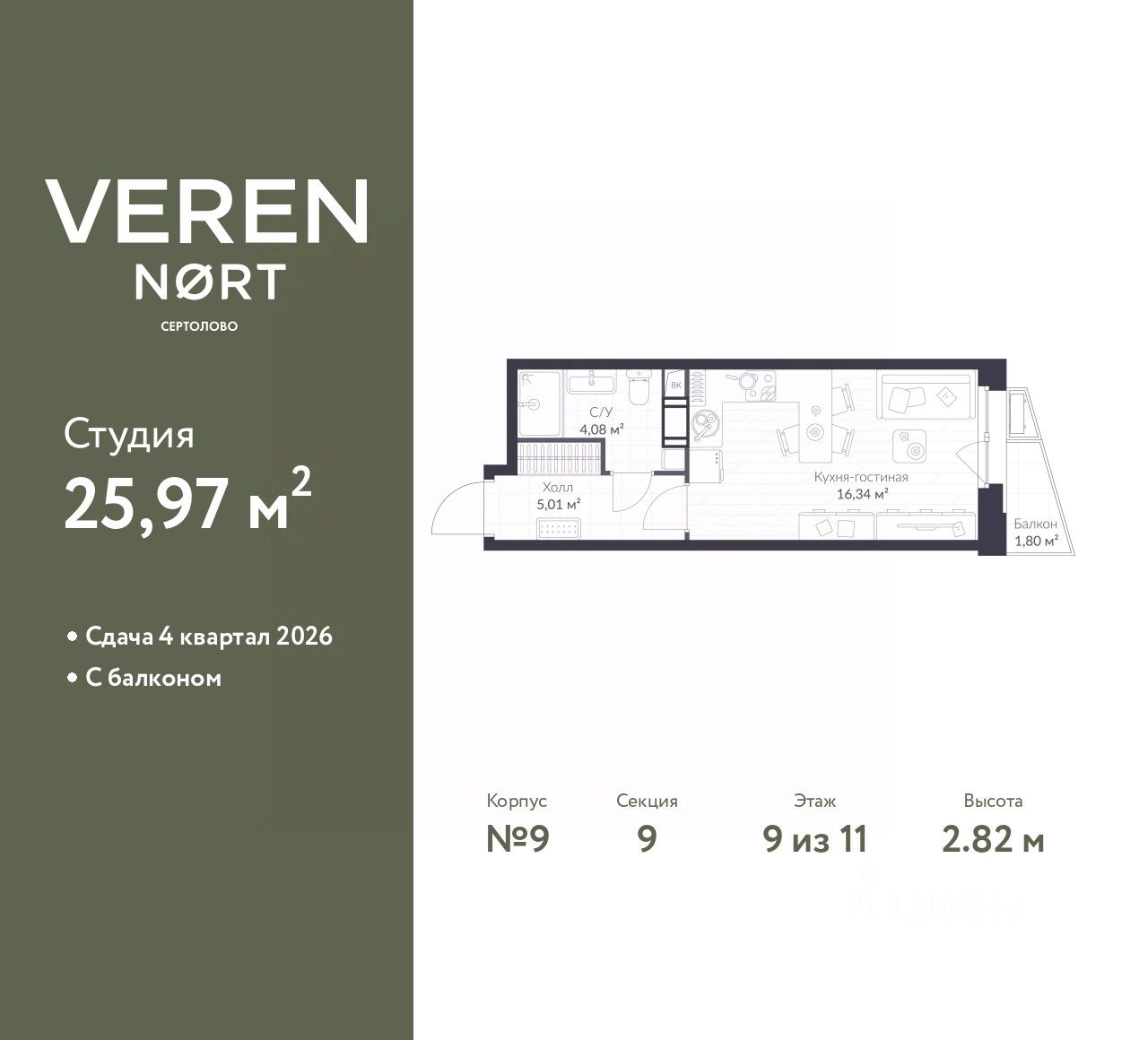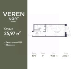 1-комн. квартира-студия в Veren Nort Сертолово на 9 этаже. Квартира без отделки, после выдачи ключей можно делать ремонт. Общая площадь: 25.97 кв.м., площадь гостиной 16.34 кв.м., из которых 5 кв.м. выделено под кухонную зону. Все окна выходят на одну сторону. В квартире один балкон, один совмещенный санузел. Высота потолков 2.82 м.