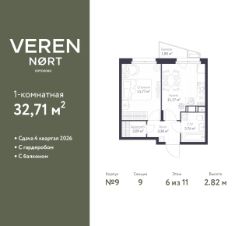 Продается однокомнатная квартира в Veren Nort Сертолово на 6 этаже. Квартира без отделки, после оформления собственности можно делать ремонт. Общая площадь: 32.71 кв.м., жилая: 11.77 кв.м., площадь просторной куxни-гостиной: 11.17 кв.м. Все окна выходят на одну сторону. В квартире один балкон, один совмещенный санузел. Высота потолков 2.82 м.