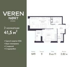 1-комн. квартира в Veren Nort Сертолово на 8 этаже. Квартира без отделки, новый владелец может сделать ремонт по индивидуальному проекту. Общая площадь: 41.5 кв.м., жилая: 11.35 кв.м., площадь просторной куxни-гостиной: 16.06 кв.м. Квартира угловая, очень светлая, естественная вентиляция при открытии окон. В квартире одна лоджия, один совмещенный санузел. Высота потолков 2.82 м.