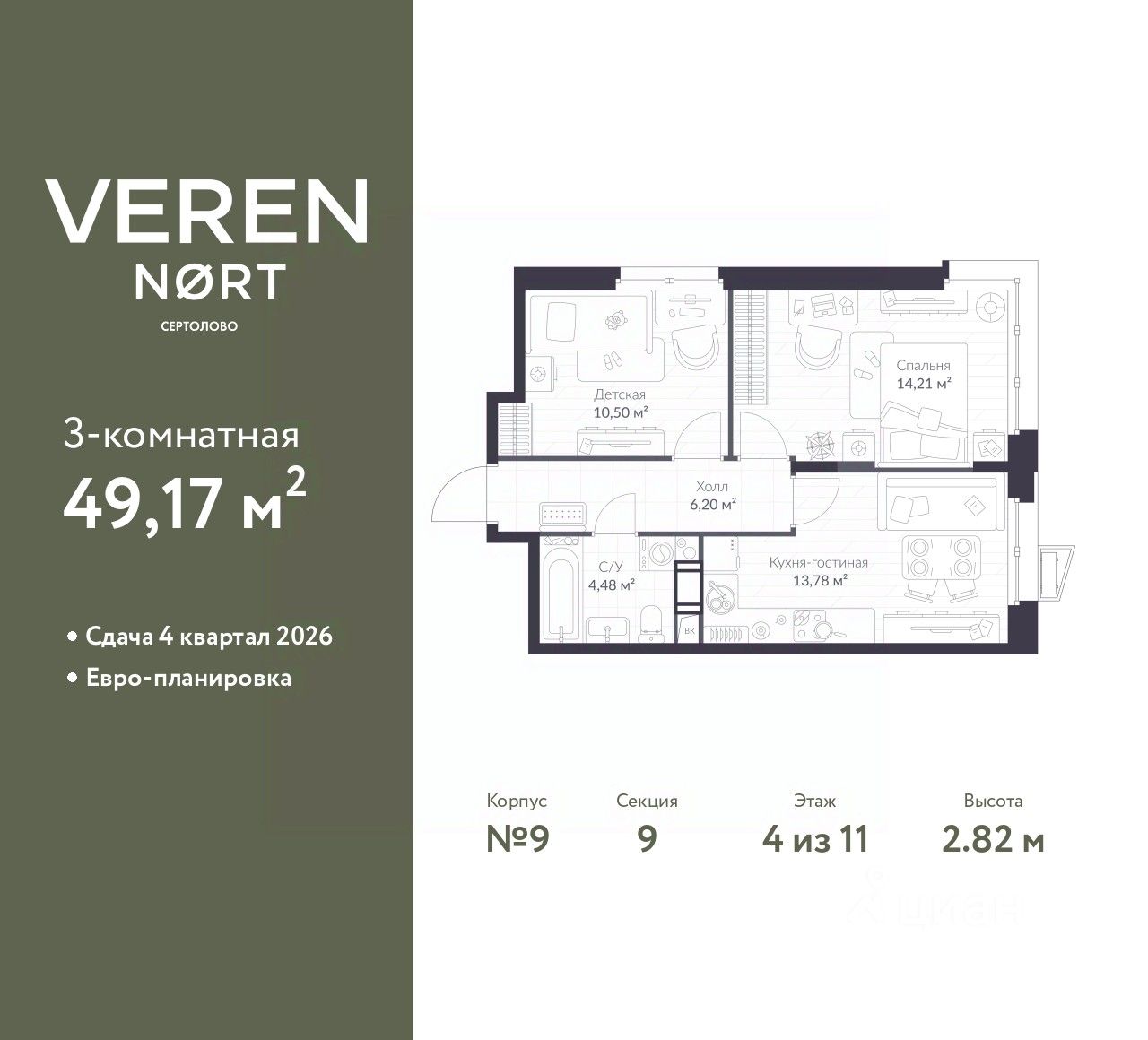 Просторная двухкомнатная квартира в Veren Nort Сертолово на 4 этаже. Квартира без отделки, новый владелец может сделать ремонт по индивидуальному проекту. Общая площадь: 49.17 кв.м., жилая: 24.71 кв.м., площадь просторной куxни-гостиной: 13.78 кв.м. Квартира угловая, очень светлая, естественная вентиляция при открытии окон. В квартире один совмещенный санузел. Высота потолков 2.82 м.