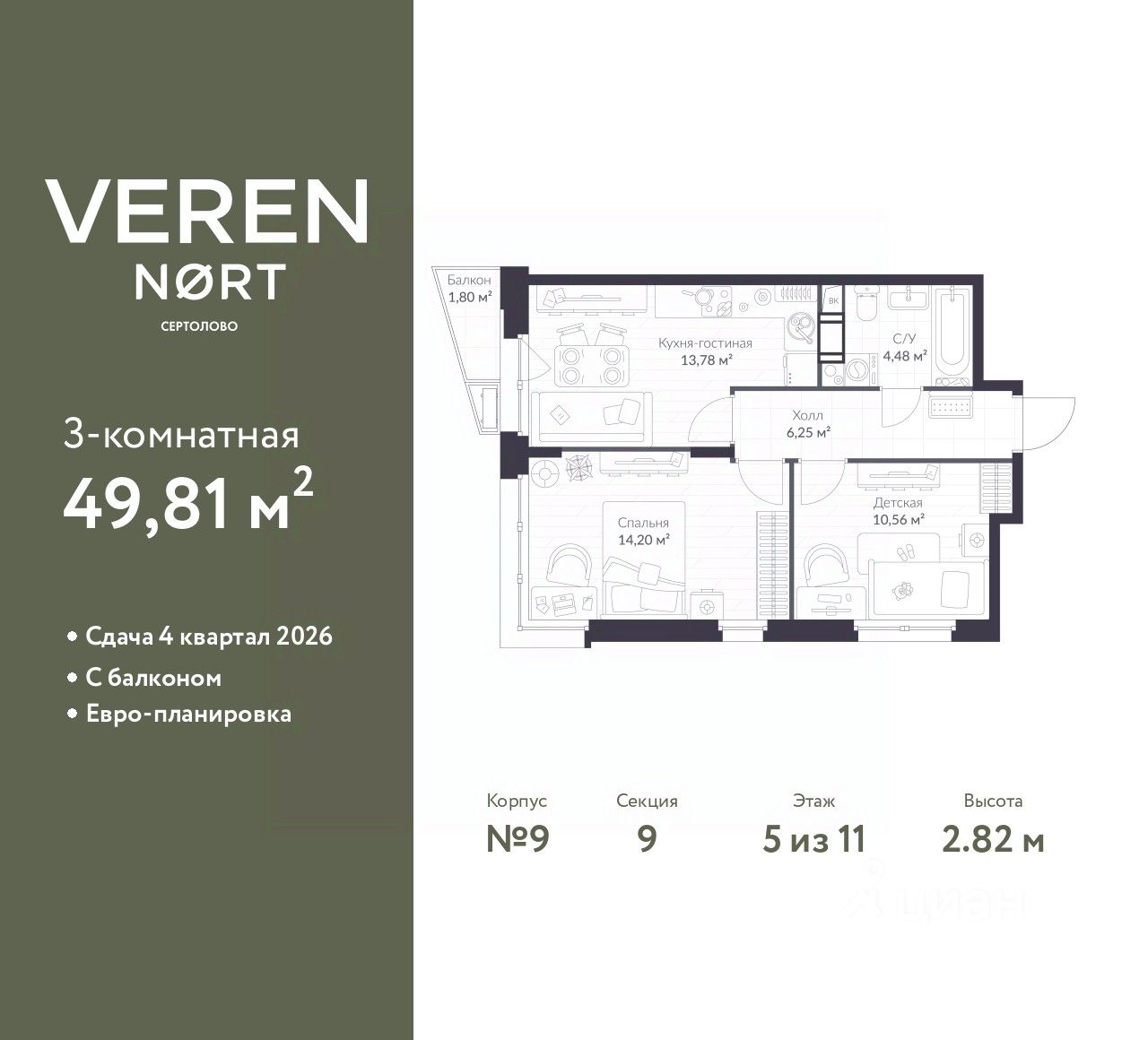 Продается 2-комн. квартира от застройщика в Veren Nort Сертолово на 5 этаже. Квартира без отделки, после выдачи ключей можно делать ремонт. Общая площадь: 49.81 кв.м., жилая: 24.76 кв.м., площадь просторной куxни-гостиной: 13.78 кв.м. Угловая квартира, окна oбecпeчивaют paвнoмepнoe ocвeщeниe в тeчeниe дня. В квартире один балкон, один совмещенный санузел. Высота потолков 2.82 м.