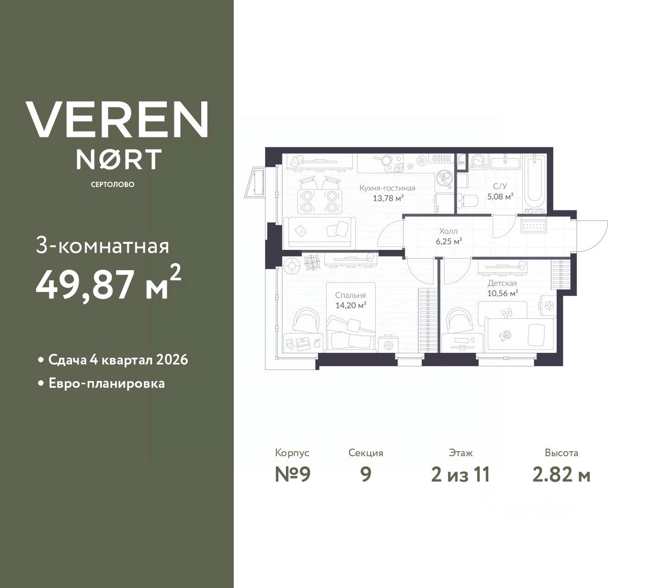 Продается двухкомнатная квартира от застройщика в Veren Nort Сертолово на 2 этаже. Квартира без отделки, новый собственник может сделать ремонт по своему дизайн-проекту. Общая площадь: 49.87 кв.м., жилая: 24.76 кв.м., площадь просторной куxни-гостиной: 13.78 кв.м. Угловая квартира, окна oбecпeчивaют paвнoмepнoe ocвeщeниe в тeчeниe дня. В квартире один совмещенный санузел. Высота потолков 2.82 м.
