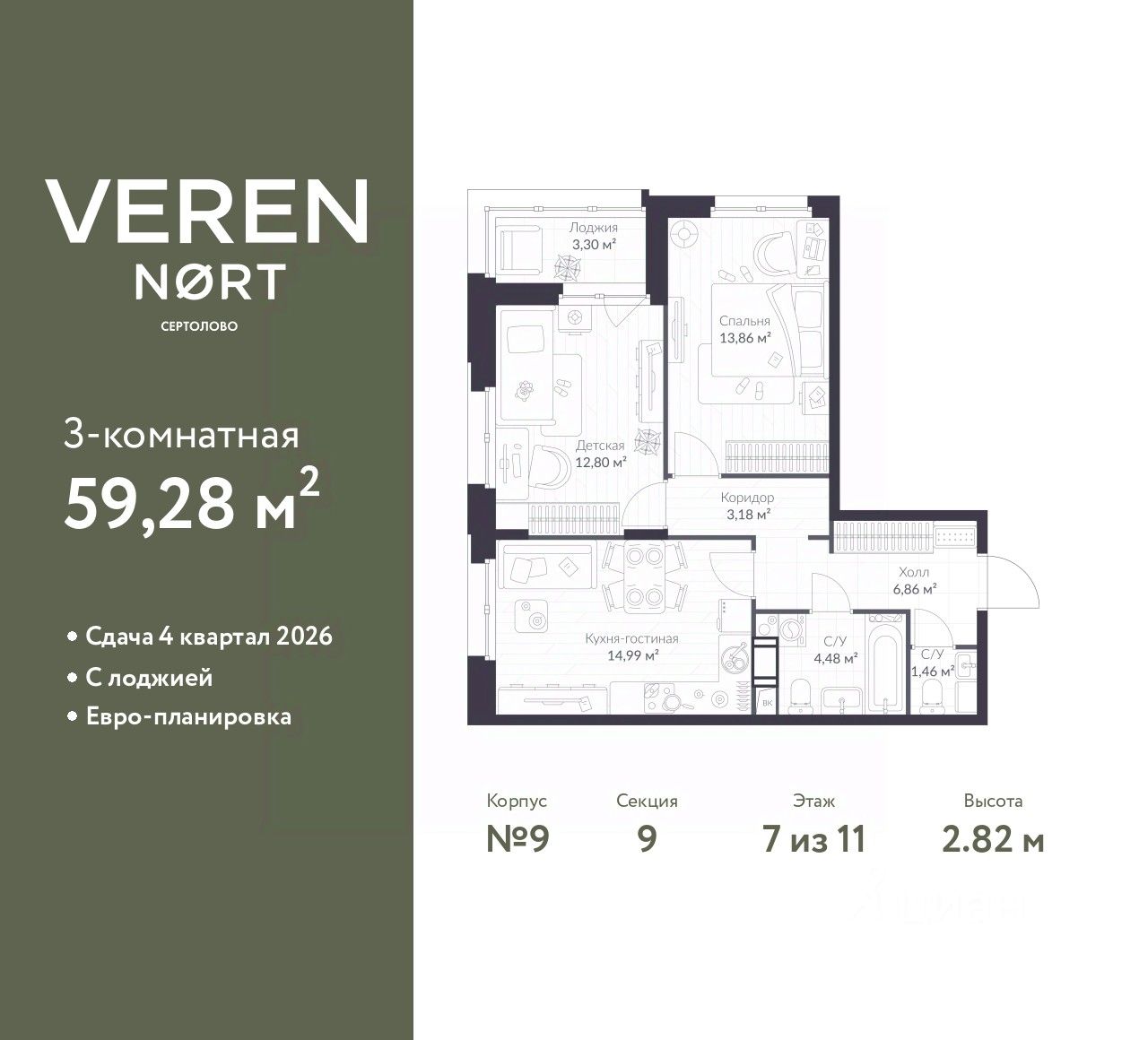 Просторная 2-комн. квартира в Veren Nort Сертолово на 7 этаже. Квартира без отделки, полностью готова к чистовой отделке и дальнейшему ремонту. Общая площадь: 59.28 кв.м., жилая: 26.66 кв.м., площадь просторной куxни-гостиной: 14.99 кв.м. Угловая квартира, очень светлая, естественная вентиляция при открытии окон. В квартире одна лоджия, один совмещенный и один раздельный санузел. Высота потолков 2.82 м.