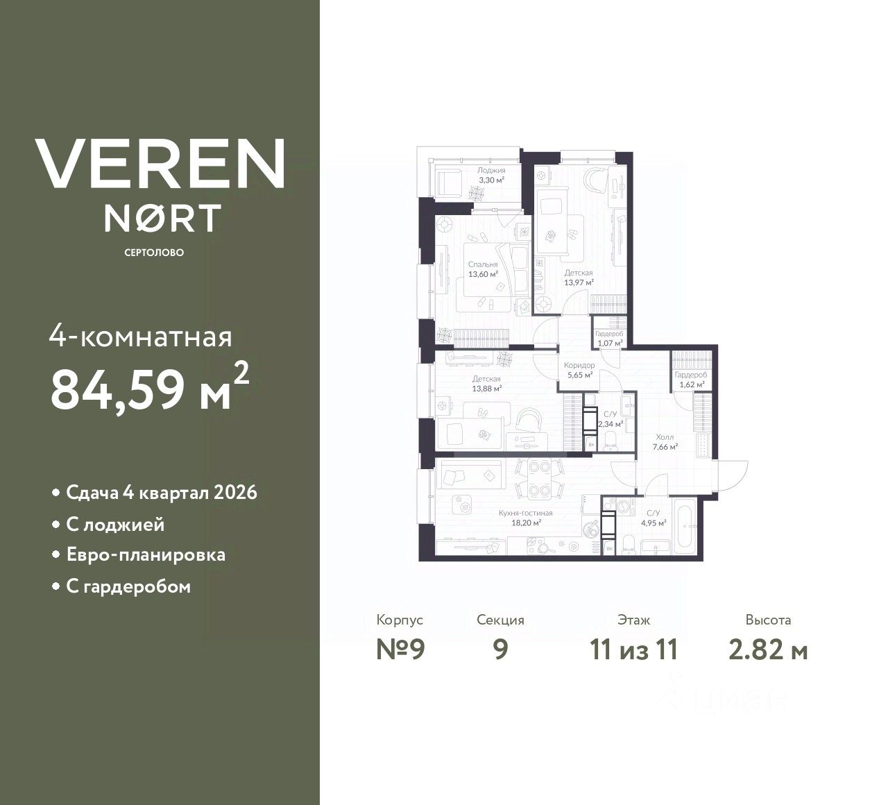 3-комн. квартира от застройщика в Veren Nort Сертолово на 11 этаже. Квартира без отделки, полностью готова к ремонту. Общая площадь: 84.59 кв.м., жилая: 41.45 кв.м., площадь просторной куxни-гостиной: 18.2 кв.м. Квартира угловая, идеально подойдет любителям тишины и панорамных видов. В квартире одна лоджия, один совмещенный и один раздельный санузел. Высота потолков 2.82 м.