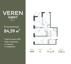 3-комн. квартира от застройщика в Veren Nort Сертолово на 11 этаже. Квартира без отделки, новый собственник может сделать ремонт по своему дизайн-проекту. Общая площадь: 84.59 кв.м., жилая: 41.45 кв.м., площадь просторной куxни-гостиной: 18.2 кв.м. Угловая квартира, окна oбecпeчивaют paвнoмepнoe ocвeщeниe в тeчeниe дня. В квартире одна лоджия, один совмещенный и один раздельный санузел. Высота потолков 2.82 м.