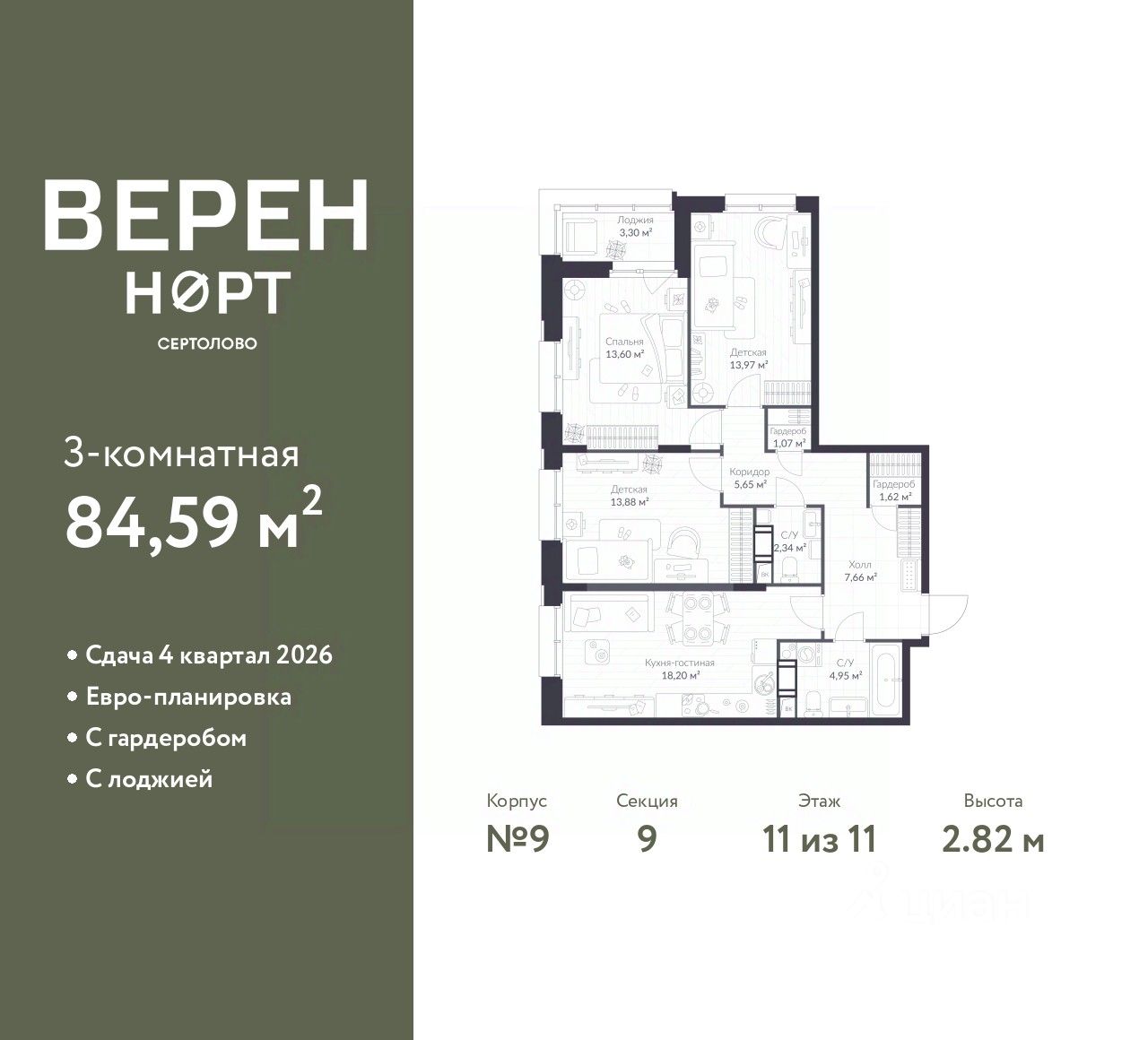 Просторная трехкомнатная квартира в ЖК "Верен Норт Сертолово" на 11 этаже. Квартира без отделки, после получения ключей можно делать ремонт. Общая площадь: 84.59 кв.м., жилая: 41.45 кв.м., площадь просторной куxни-гостиной: 18.2 кв.м. Угловая квартира, идеально подойдет любителям тишины и панорамных видов. В квартире одна лоджия, один совмещенный и один раздельный санузел. Высота потолков 2.82 м.