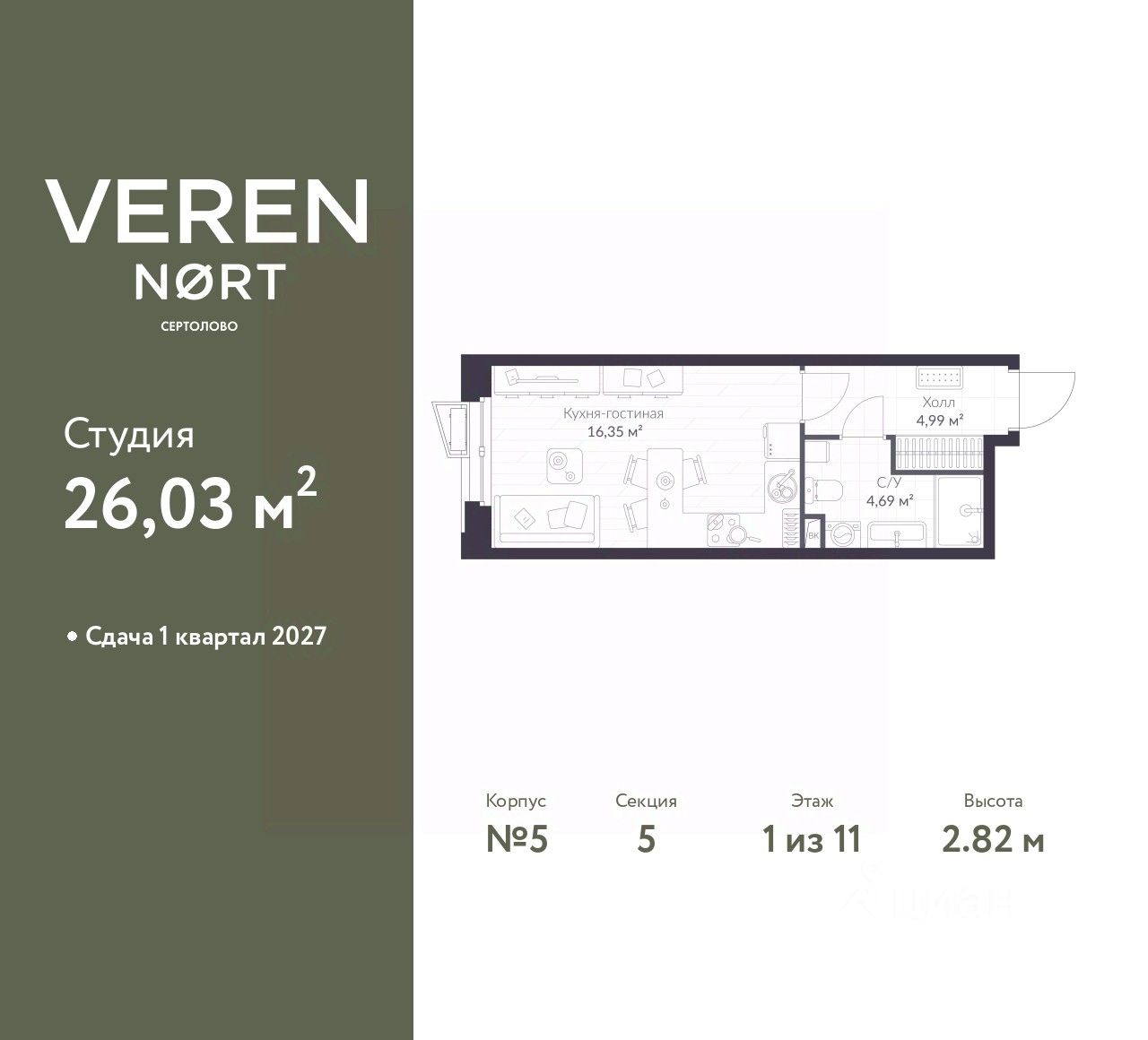 1-комн. квартира-студия от застройщика в Veren Nort Сертолово на 1 этаже. Квартира без отделки, после оформления собственности можно делать ремонт. Общая площадь: 26.03 кв.м., площадь гостиной 16.34 кв.м., из которых 5 кв.м. выделено под кухонную зону. Все окна выходят на одну сторону. В квартире один совмещенный санузел. Высота потолков 2.82 м.