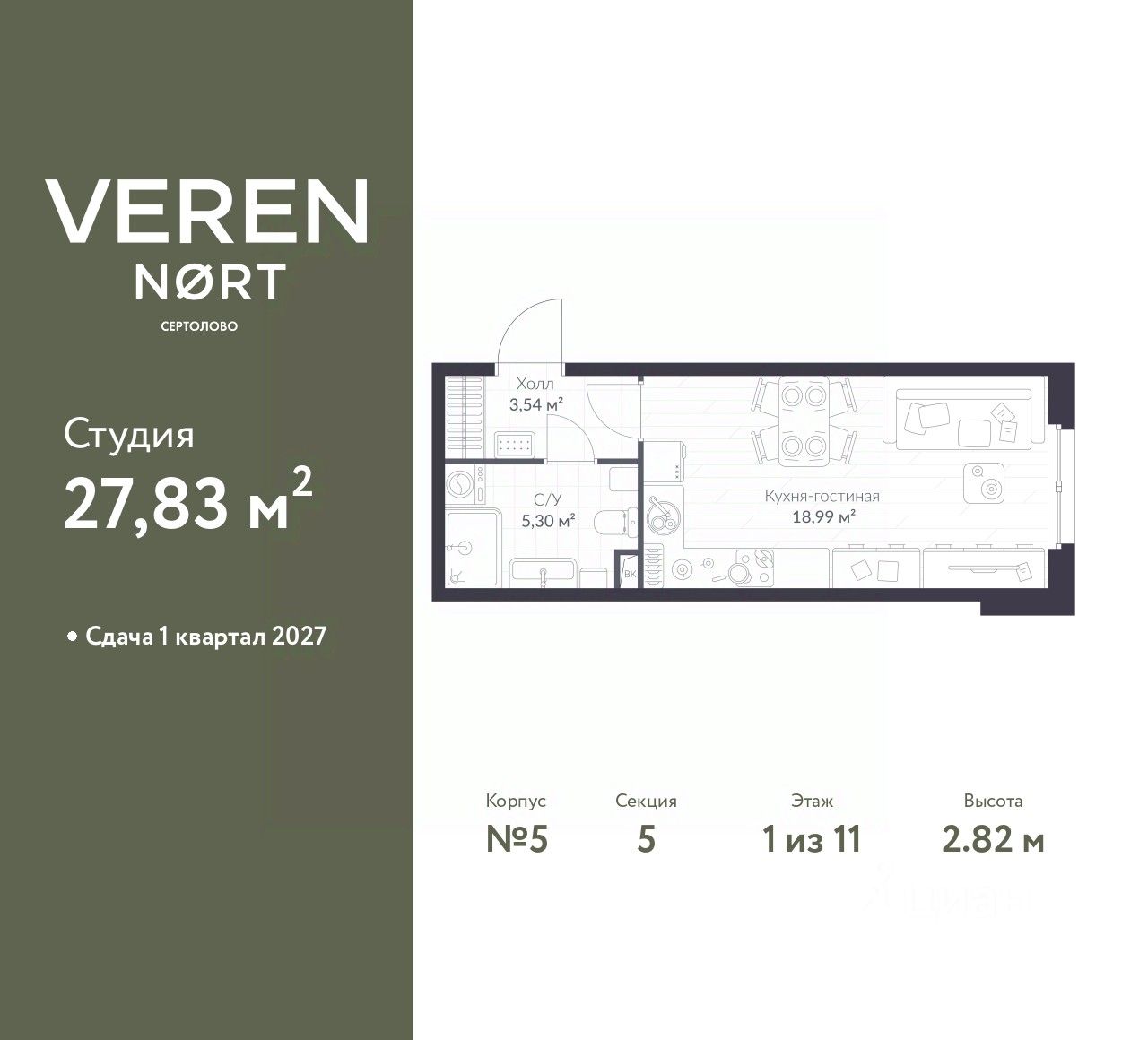 1-комн. квартира-студия от застройщика в Veren Nort Сертолово на 1 этаже. Квартира без отделки, после оформления собственности можно делать ремонт. Общая площадь: 27.83 кв.м., площадь гостиной 18.99 кв.м., из которых 5 кв.м. выделено под кухонную зону. Все окна выходят на одну сторону. В квартире один совмещенный санузел. Высота потолков 2.82 м.