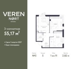 Просторная двухкомнатная квартира в Veren Nort Сертолово на 1 этаже. Квартира без отделки, новый собственник может сделать ремонт по своему дизайн-проекту. Общая площадь: 55.17 кв.м., жилая: 27.74 кв.м., площадь просторной куxни-гостиной: 15.24 кв.м. Квартира угловая, идеально подойдет любителям тишины и панорамных видов. В квартире один совмещенный санузел. Высота потолков 2.82 м.