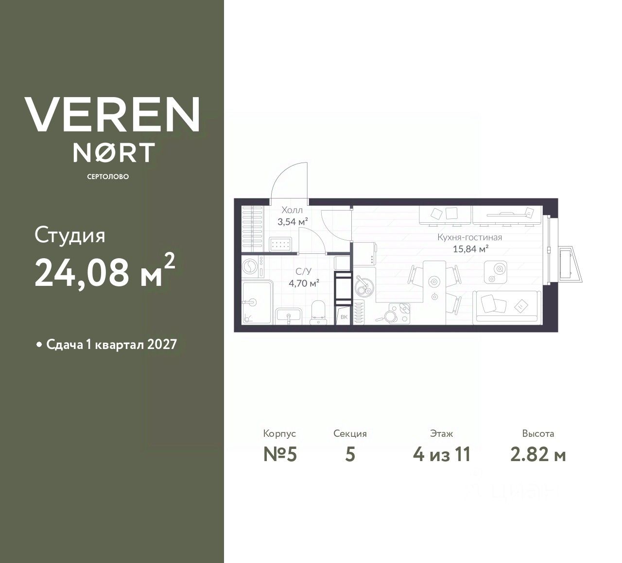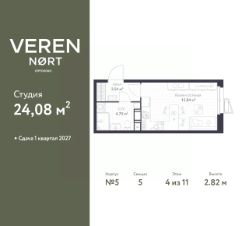 1-комн. квартира-студия в Veren Nort Сертолово на 4 этаже. Квартира без отделки, полностью готова к чистовой отделке и дальнейшему ремонту. Общая площадь: 24.08 кв.м., площадь гостиной 15.84 кв.м., из которых 5 кв.м. выделено под кухонную зону. Все окна выходят на одну сторону. В квартире один совмещенный санузел. Высота потолков 2.82 м.