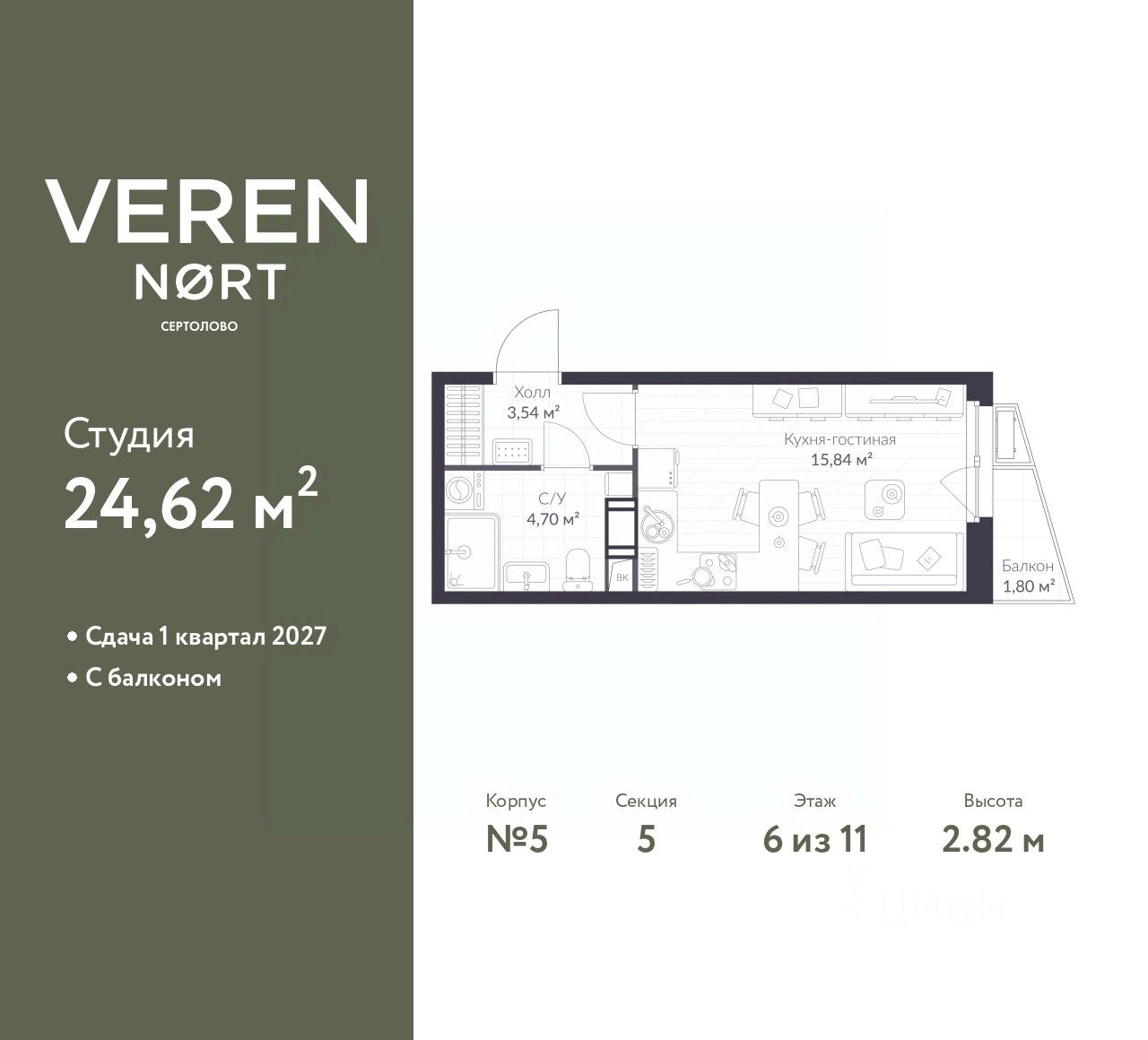 1-комн. квартира-студия от застройщика в Veren Nort Сертолово на 6 этаже. Квартира без отделки, новый собственник может сделать ремонт по своему дизайн-проекту. Общая площадь: 24.62 кв.м., площадь гостиной 15.84 кв.м., из которых 5 кв.м. выделено под кухонную зону. Все окна выходят на одну сторону. В квартире один балкон, один совмещенный санузел. Высота потолков 2.82 м.