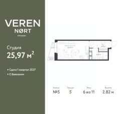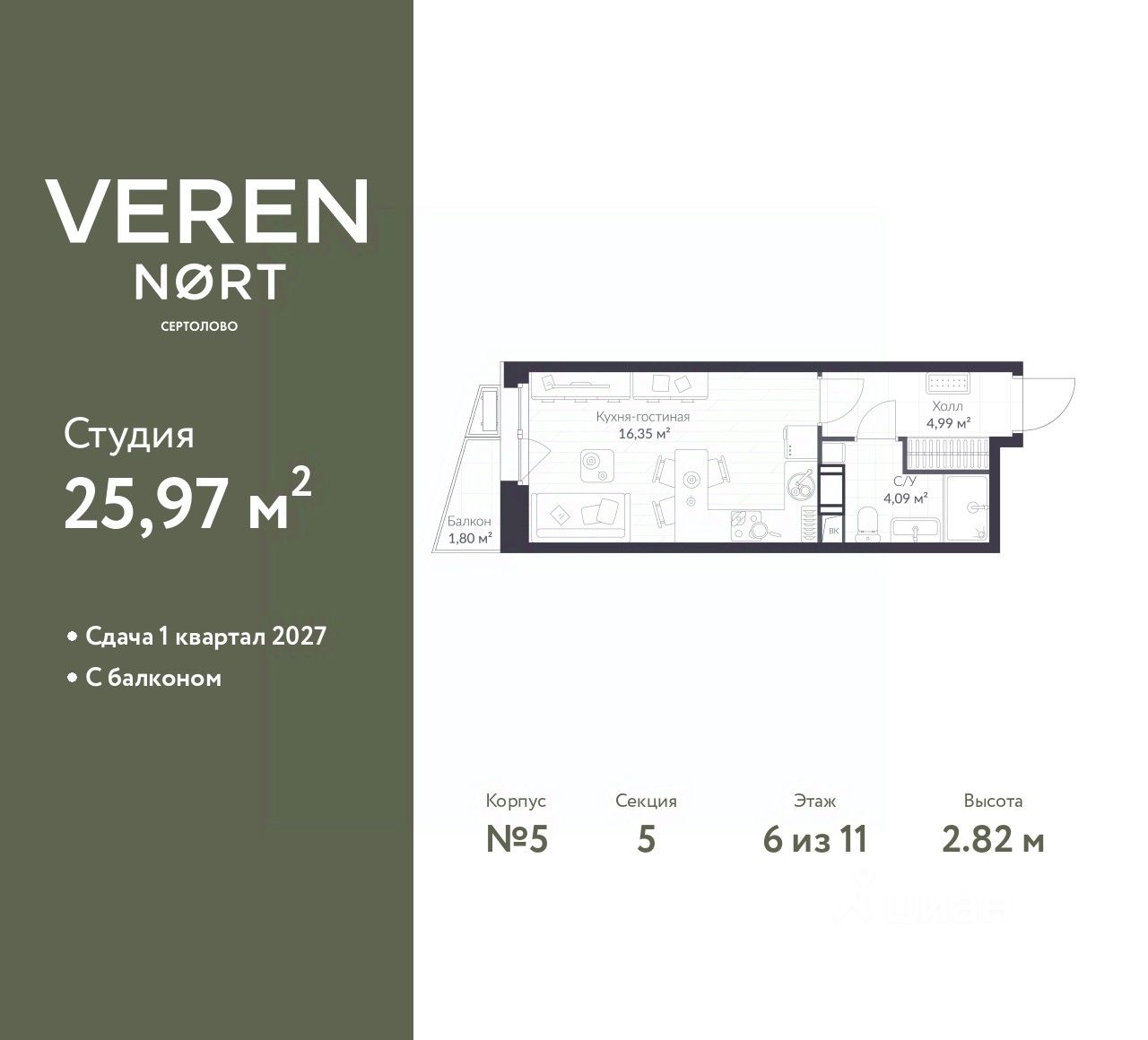 Однокомнатная квартира-студия в Veren Nort Сертолово на 6 этаже. Квартира без отделки, после оформления собственности можно делать ремонт. Общая площадь: 25.97 кв.м., площадь гостиной 16.34 кв.м., из которых 5 кв.м. выделено под кухонную зону. Все окна выходят на одну сторону. В квартире один балкон, один совмещенный санузел. Высота потолков 2.82 м.