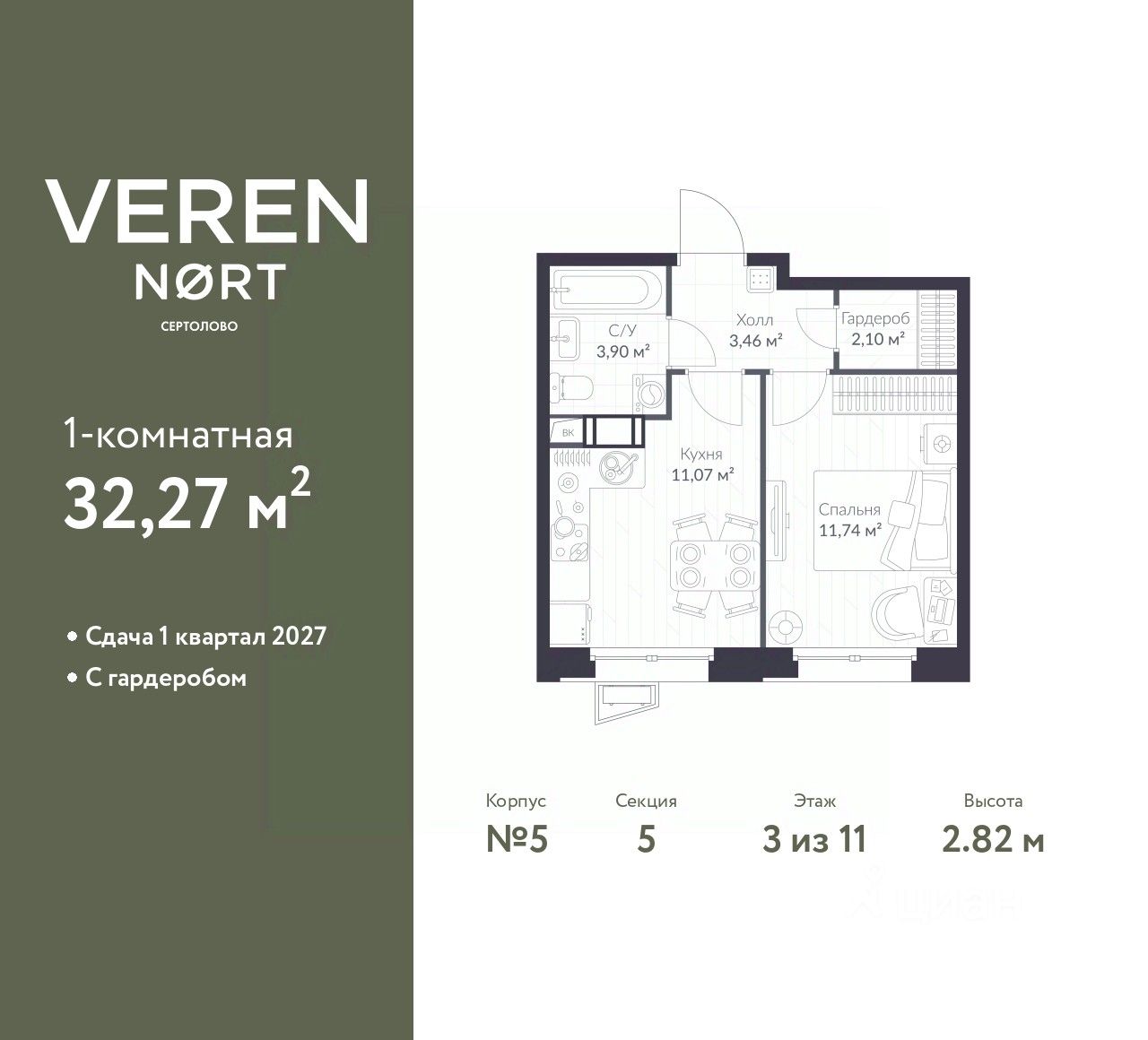 Продается однокомнатная квартира в Veren Nort Сертолово на 3 этаже. Квартира без отделки, после получения ключей можно делать ремонт. Общая площадь: 32.27 кв.м., жилая: 11.74 кв.м., площадь просторной куxни-гостиной: 11.07 кв.м. Все окна выходят на одну сторону. В квартире один совмещенный санузел. Высота потолков 2.82 м.