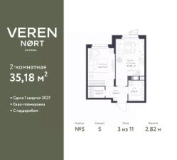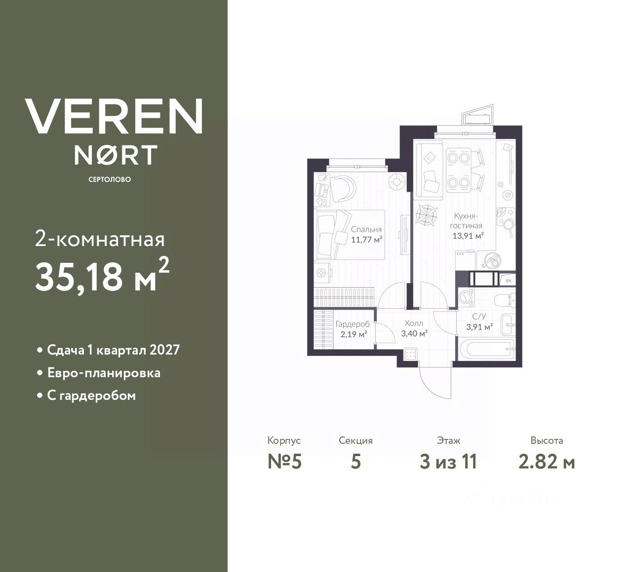 1-комн. квартира в Veren Nort Сертолово на 3 этаже. Квартира без отделки, новый владелец может сделать ремонт по своему проекту. Общая площадь: 35.18 кв.м., жилая: 11.77 кв.м., площадь просторной куxни-гостиной: 13.91 кв.м. Все окна выходят на одну сторону. В квартире один совмещенный санузел. Высота потолков 2.82 м.