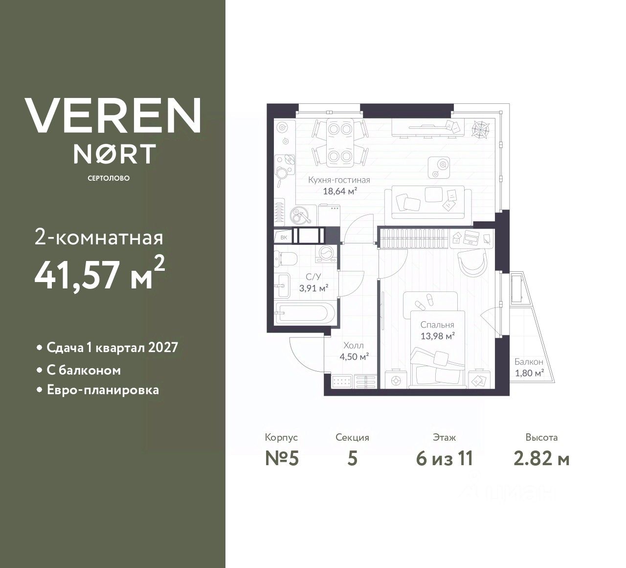 1-комн. квартира в Veren Nort Сертолово на 6 этаже. Квартира без отделки, после получения ключей можно делать ремонт. Общая площадь: 41.57 кв.м., жилая: 13.95 кв.м., площадь просторной куxни-гостиной: 18.88 кв.м. Угловая квартира, идеально подойдет любителям тишины и панорамных видов. В квартире один балкон, один совмещенный санузел. Высота потолков 2.82 м.
