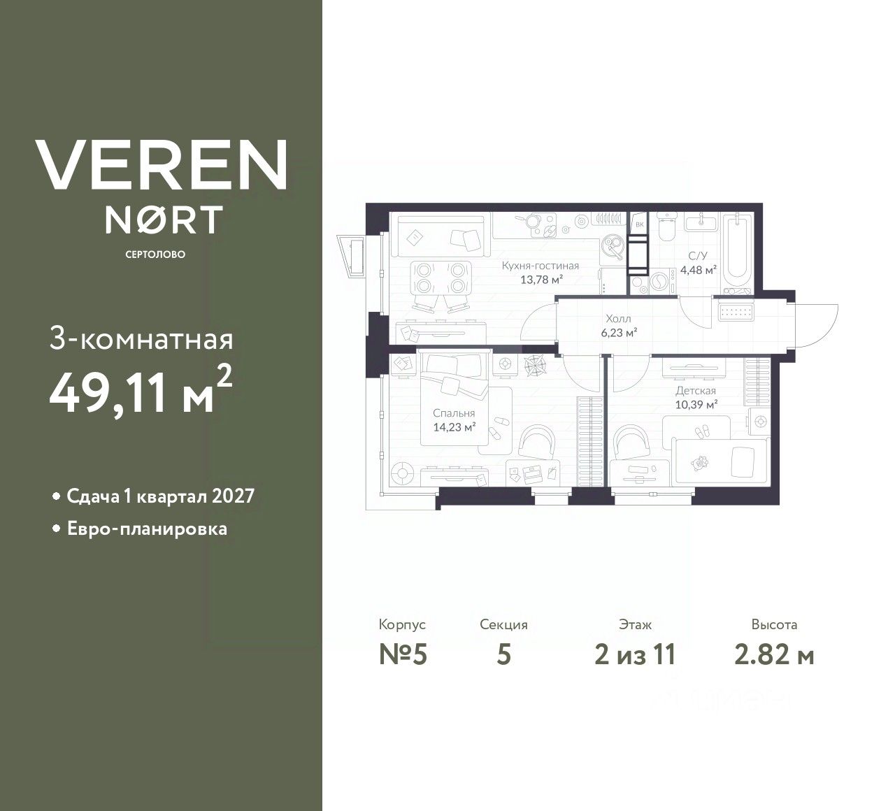 Продается 2-комн. квартира в Veren Nort Сертолово на 2 этаже. Квартира без отделки, после оформления собственности можно делать ремонт. Общая площадь: 49.11 кв.м., жилая: 24.62 кв.м., площадь просторной куxни-гостиной: 13.78 кв.м. Квартира угловая, идеально подойдет любителям тишины и панорамных видов. В квартире один совмещенный санузел. Высота потолков 2.82 м.