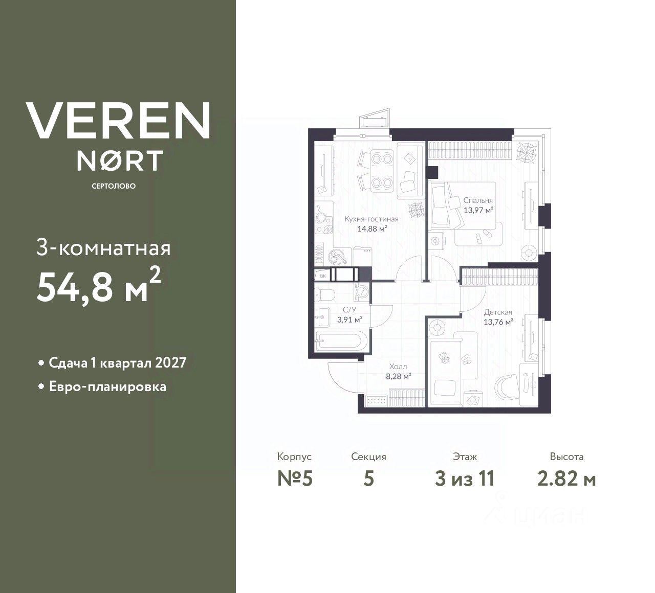 Продается 2-комн. квартира в Veren Nort Сертолово на 3 этаже. Квартира без отделки, полностью готова к ремонту. Общая площадь: 54.8 кв.м., жилая: 27.73 кв.м., площадь просторной куxни-гостиной: 14.88 кв.м. Квартира угловая, идеально подойдет любителям тишины и панорамных видов. В квартире один совмещенный санузел. Высота потолков 2.82 м.