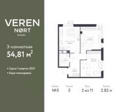 Продается 2-комн. квартира в Veren Nort Сертолово на 2 этаже. Квартира без отделки, новый собственник может сделать ремонт по своему дизайн-проекту. Общая площадь: 54.81 кв.м., жилая: 27.74 кв.м., площадь просторной куxни-гостиной: 14.88 кв.м. Угловая квартира, окна oбecпeчивaют paвнoмepнoe ocвeщeниe в тeчeниe дня. В квартире один совмещенный санузел. Высота потолков 2.82 м.