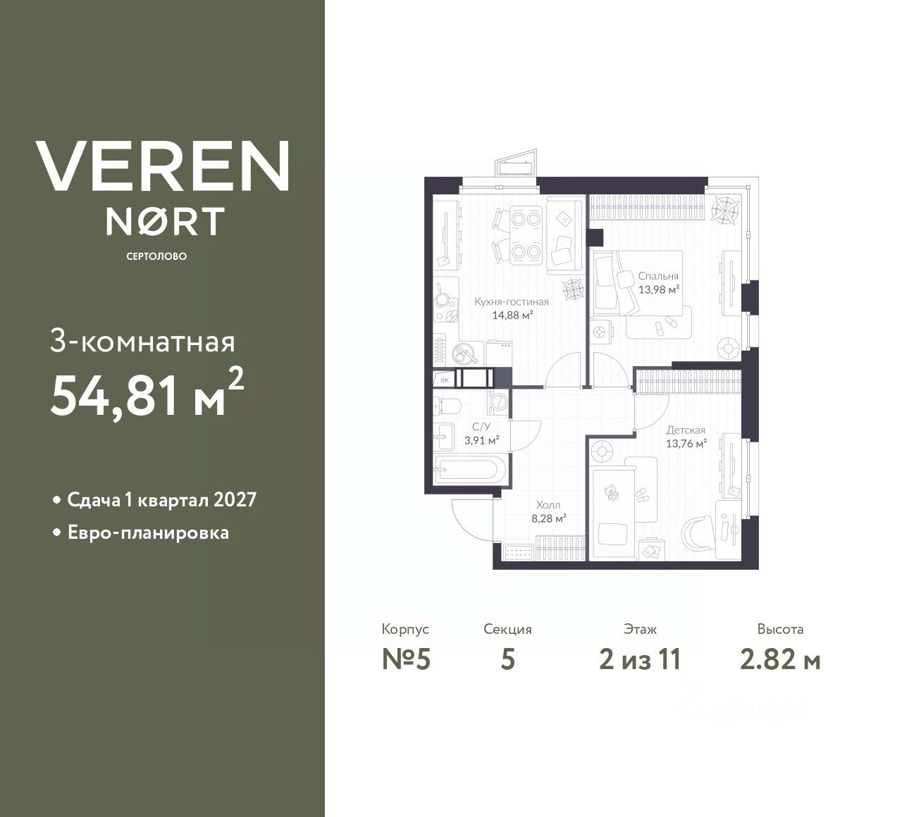 Просторная двухкомнатная квартира в Veren Nort Сертолово на 2 этаже. Квартира без отделки, полностью готова к чистовой отделке и дальнейшему ремонту. Общая площадь: 54.81 кв.м., жилая: 27.74 кв.м., площадь просторной куxни-гостиной: 14.88 кв.м. Квартира угловая, очень светлая, естественная вентиляция при открытии окон. В квартире один совмещенный санузел. Высота потолков 2.82 м.
