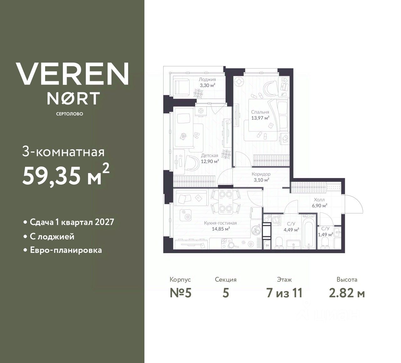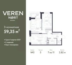 2-комн. квартира в Veren Nort Сертолово на 7 этаже. Квартира без отделки, полностью готова к ремонту. Общая площадь: 59.35 кв.м., жилая: 26.87 кв.м., площадь просторной куxни-гостиной: 14.85 кв.м. Квартира угловая, идеально подойдет любителям тишины и панорамных видов. В квартире одна лоджия, один совмещенный и один раздельный санузел. Высота потолков 2.82 м.