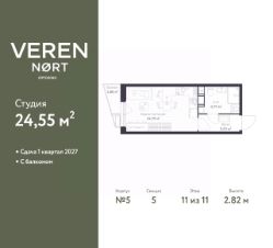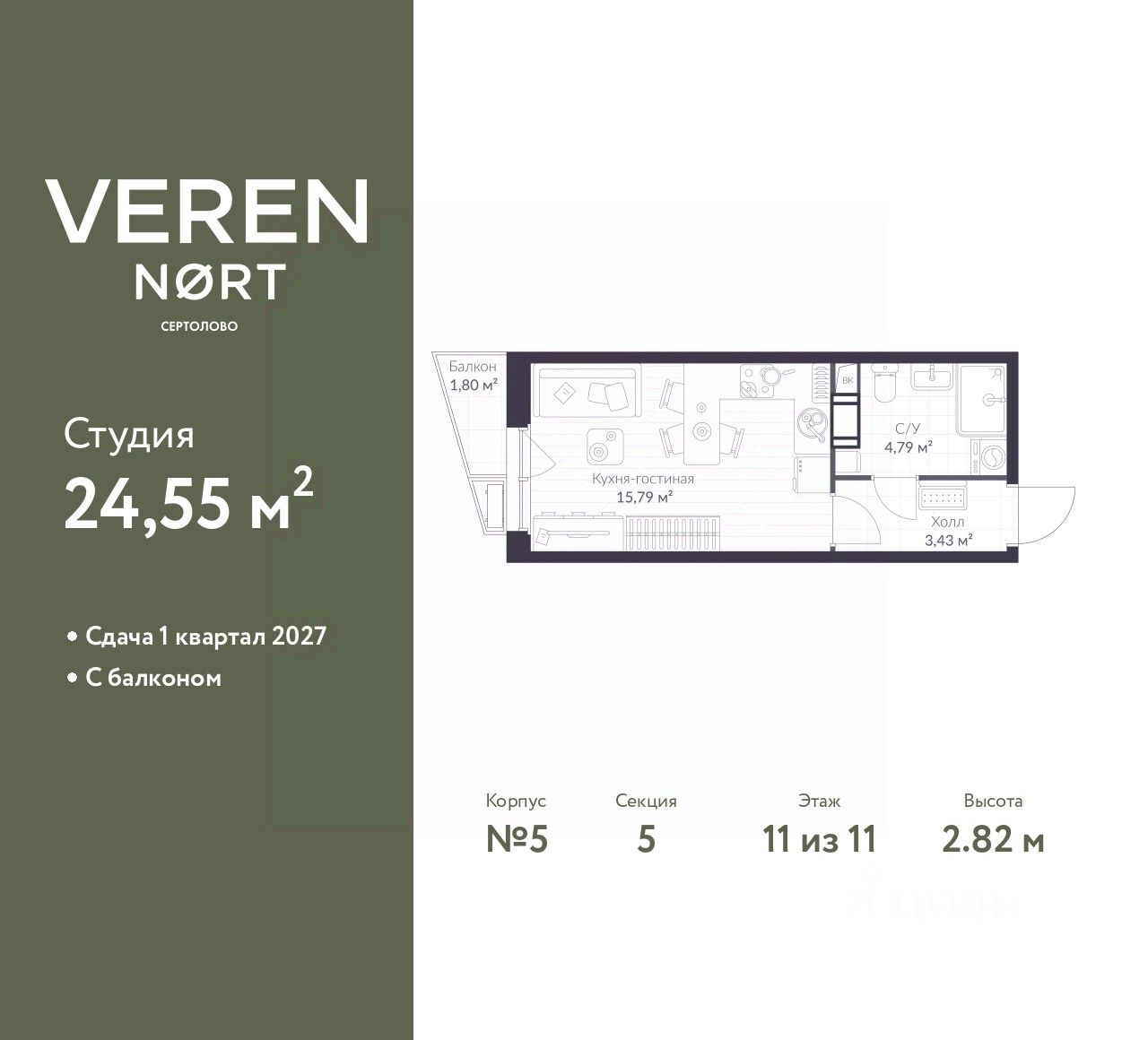 Просторная 1-комн. квартира-студия в Veren Nort Сертолово на 11 этаже. Квартира без отделки, полностью готова к чистовой отделке и дальнейшему ремонту. Общая площадь: 24.55 кв.м., площадь гостиной 15.79 кв.м., из которых 5 кв.м. выделено под кухонную зону. Все окна выходят на одну сторону. В квартире один балкон, один совмещенный санузел. Высота потолков 2.82 м.