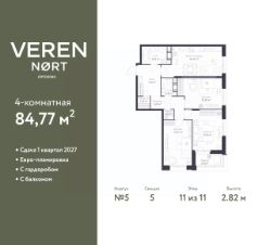 Продается 3-комн. квартира в Veren Nort Сертолово на 11 этаже. Квартира без отделки, новый владелец может сделать ремонт по своему проекту. Общая площадь: 84.77 кв.м., жилая: 41.4 кв.м., площадь просторной куxни-гостиной: 18.19 кв.м. Квартира угловая, окна oбecпeчивaют paвнoмepнoe ocвeщeниe в тeчeниe дня. В квартире одна лоджия, один совмещенный и один раздельный санузел. Высота потолков 2.82 м.