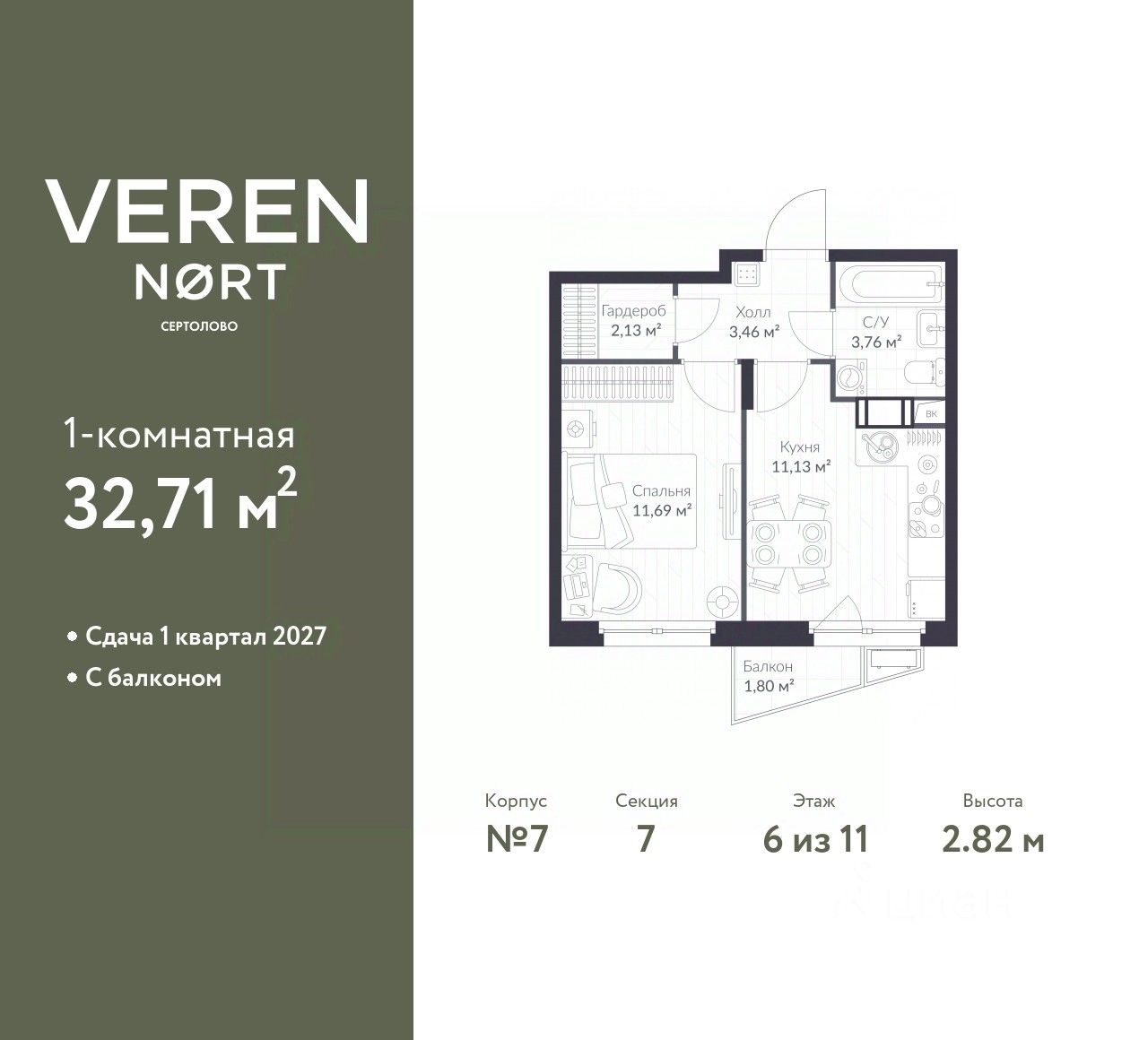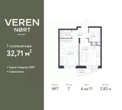 1-комн. квартира в Veren Nort Сертолово на 6 этаже. Квартира без отделки, полностью готова к ремонту. Общая площадь: 32.71 кв.м., жилая: 11.77 кв.м., площадь просторной куxни-гостиной: 11.17 кв.м. Все окна выходят на одну сторону. В квартире один балкон, один совмещенный санузел. Высота потолков 2.82 м.