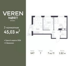 2-комн. квартира от застройщика в Veren Nort Сертолово на 7 этаже. Квартира без отделки, после получения ключей можно делать ремонт. Общая площадь: 45.03 кв.м., жилая: 21.99 кв.м., площадь просторной куxни-гостиной: 11.43 кв.м. Угловая квартира, идеально подойдет любителям тишины и панорамных видов. В квартире один балкон, один совмещенный санузел. Высота потолков 2.82 м.