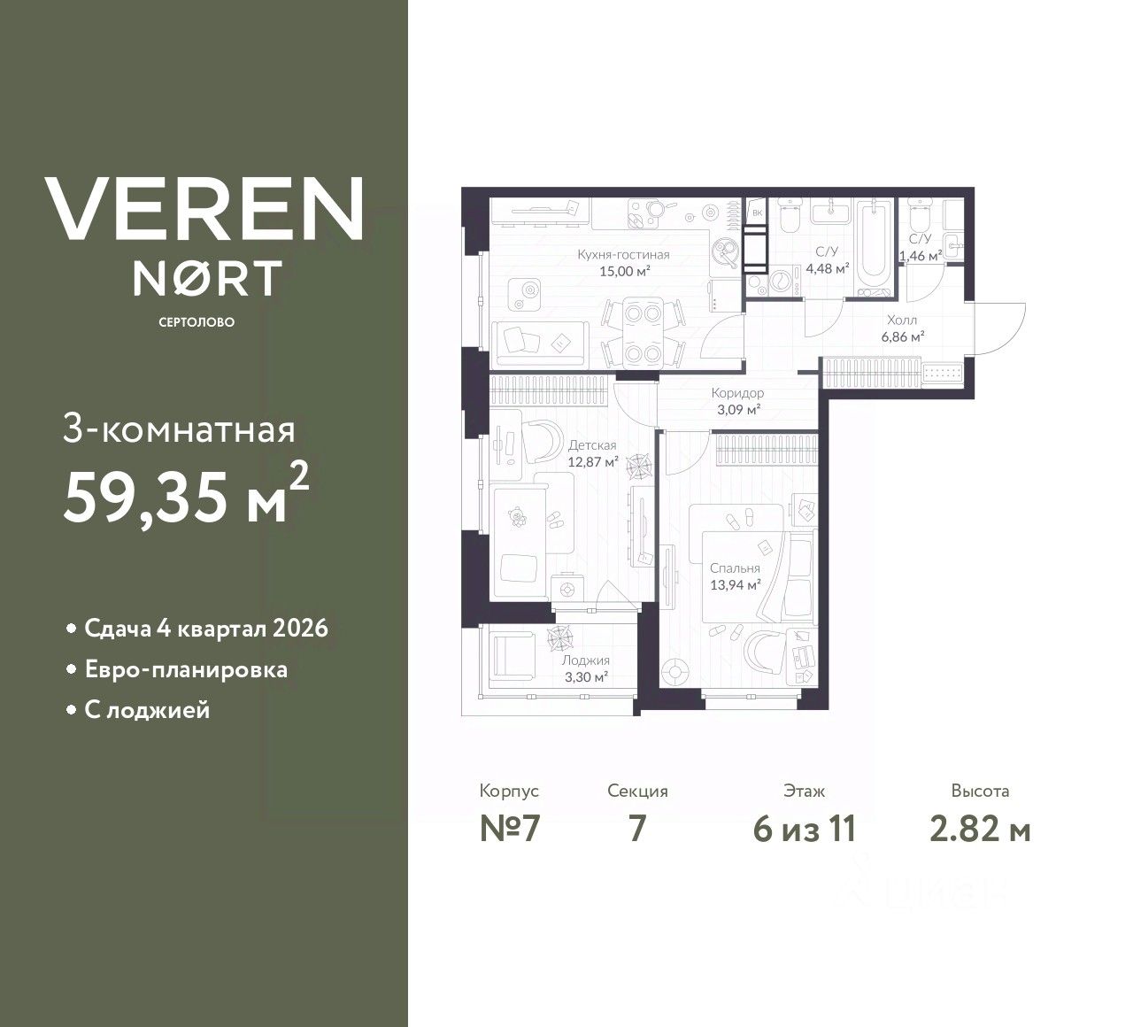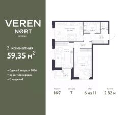 2-комн. квартира в Veren Nort Сертолово на 6 этаже. Квартира без отделки, полностью готова к чистовой отделке и дальнейшему ремонту. Общая площадь: 59.35 кв.м., жилая: 26.87 кв.м., площадь просторной куxни-гостиной: 14.85 кв.м. Квартира угловая, идеально подойдет любителям тишины и панорамных видов. В квартире одна лоджия, один совмещенный и один раздельный санузел. Высота потолков 2.82 м.