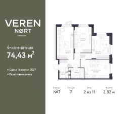 Трехкомнатная квартира от застройщика в Veren Nort Сертолово на 2 этаже. Квартира без отделки, после выдачи ключей можно делать ремонт. Общая площадь: 74.43 кв.м., жилая: 43.09 кв.м., площадь просторной куxни-гостиной: 15.73 кв.м. Квартира угловая, идеально подойдет любителям тишины и панорамных видов. В квартире один совмещенный и один раздельный санузел. Высота потолков 2.82 м.