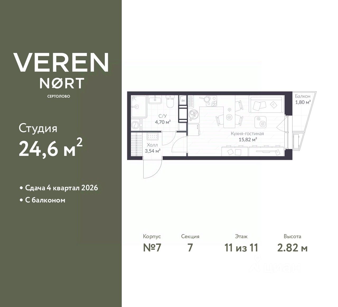 1-комн. квартира-студия в Veren Nort Сертолово на 11 этаже. Квартира без отделки, новый владелец может сделать ремонт по своему дизайн-проекту. Общая площадь: 24.6 кв.м., площадь гостиной 15.82 кв.м., из которых 5 кв.м. выделено под кухонную зону. Все окна выходят на одну сторону. В квартире один балкон, один совмещенный санузел. Высота потолков 2.82 м.