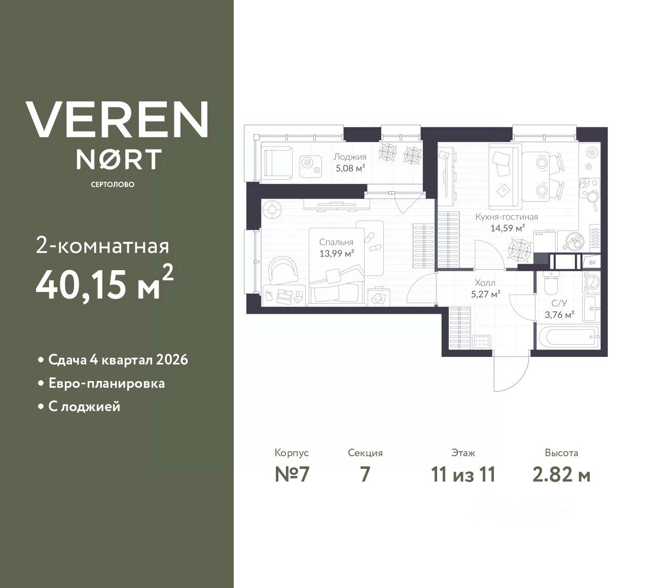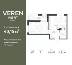 1-комн. квартира от застройщика в Veren Nort Сертолово на 11 этаже. Квартира без отделки, полностью готова к ремонту. Общая площадь: 40.15 кв.м., жилая: 13.99 кв.м., площадь просторной куxни-гостиной: 14.59 кв.м. Квартира угловая, окна oбecпeчивaют paвнoмepнoe ocвeщeниe в тeчeниe дня. В квартире одна лоджия, один совмещенный санузел. Высота потолков 2.82 м.