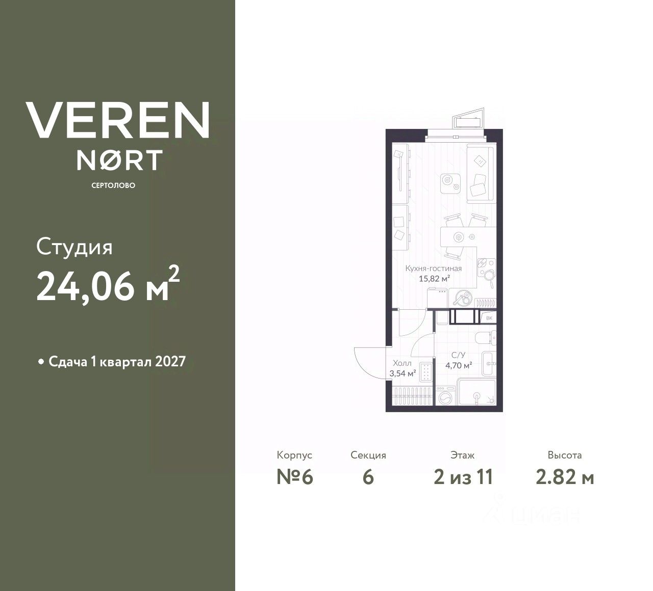 Продается 1-комн. квартира-студия в Veren Nort Сертолово на 2 этаже. Квартира без отделки, после выдачи ключей можно делать ремонт. Общая площадь: 24.06 кв.м., площадь гостиной 15.82 кв.м., из которых 5 кв.м. выделено под кухонную зону. Все окна выходят на одну сторону. В квартире один совмещенный санузел. Высота потолков 2.82 м.