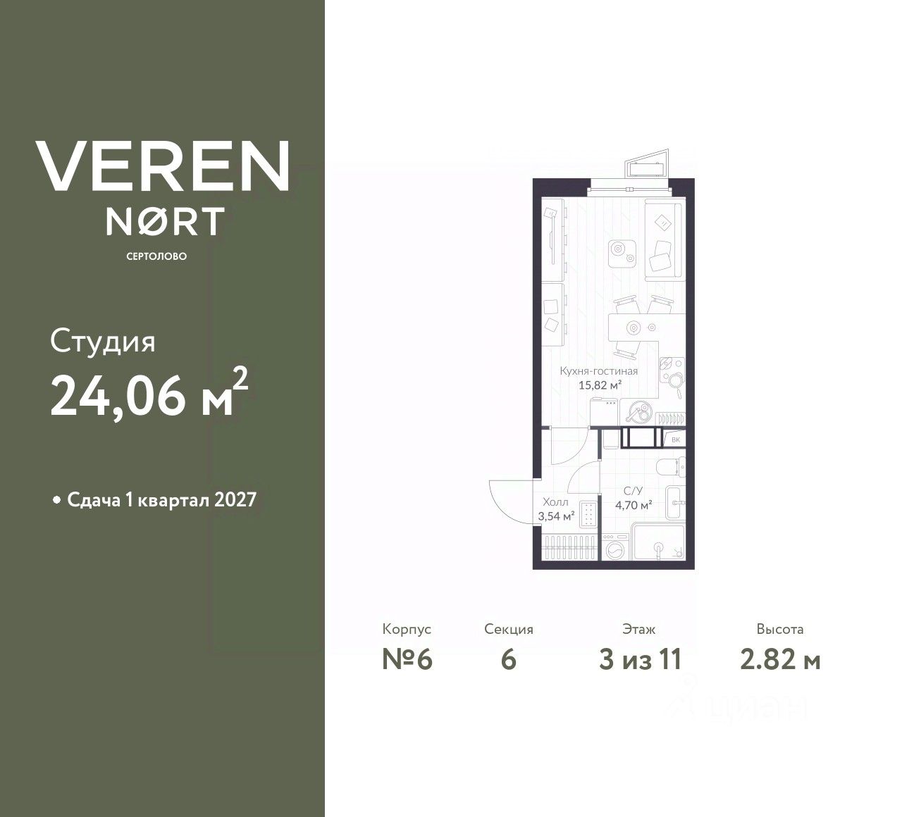 Однокомнатная квартира-студия от застройщика в Veren Nort Сертолово на 3 этаже. Квартира без отделки, новый собственник может сделать ремонт по индивидуальному проекту. Общая площадь: 24.06 кв.м., площадь гостиной 15.82 кв.м., из которых 5 кв.м. выделено под кухонную зону. Все окна выходят на одну сторону. В квартире один совмещенный санузел. Высота потолков 2.82 м.