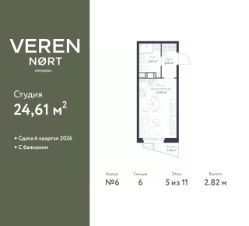 1-комн. квартира-студия от застройщика в Veren Nort Сертолово на 5 этаже. Квартира без отделки, полностью готова к чистовой отделке и дальнейшему ремонту. Общая площадь: 24.61 кв.м., площадь гостиной 15.82 кв.м., из которых 5 кв.м. выделено под кухонную зону. Все окна выходят на одну сторону. В квартире один балкон, один совмещенный санузел. Высота потолков 2.82 м.