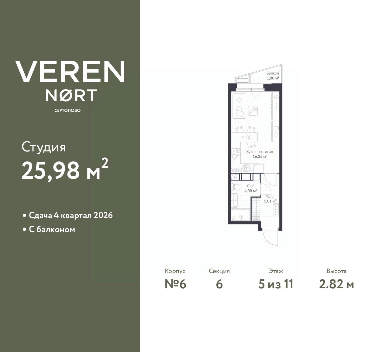 1-комн. квартира-студия в Veren Nort Сертолово на 5 этаже. Квартира без отделки, новый владелец может сделать ремонт по своему проекту. Общая площадь: 25.98 кв.м., площадь гостиной 16.35 кв.м., из которых 5 кв.м. выделено под кухонную зону. Все окна выходят на одну сторону. В квартире один балкон, один совмещенный санузел. Высота потолков 2.82 м.