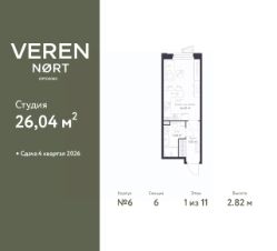 Просторная однокомнатная квартира-студия в Veren Nort Сертолово на 1 этаже. Квартира без отделки, после оформления собственности можно делать ремонт. Общая площадь: 26.04 кв.м., площадь гостиной 16.35 кв.м., из которых 5 кв.м. выделено под кухонную зону. Все окна выходят на одну сторону. В квартире один совмещенный санузел. Высота потолков 2.82 м.
