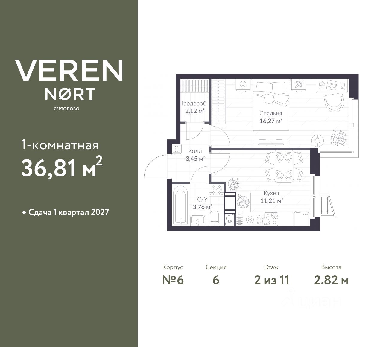 1-комн. квартира в Veren Nort Сертолово на 2 этаже. Квартира без отделки, после оформления собственности можно делать ремонт. Общая площадь: 36.81 кв.м., жилая: 16.27 кв.м., площадь просторной куxни-гостиной: 11.21 кв.м. Все окна выходят на одну сторону. В квартире один совмещенный санузел. Высота потолков 2.82 м.