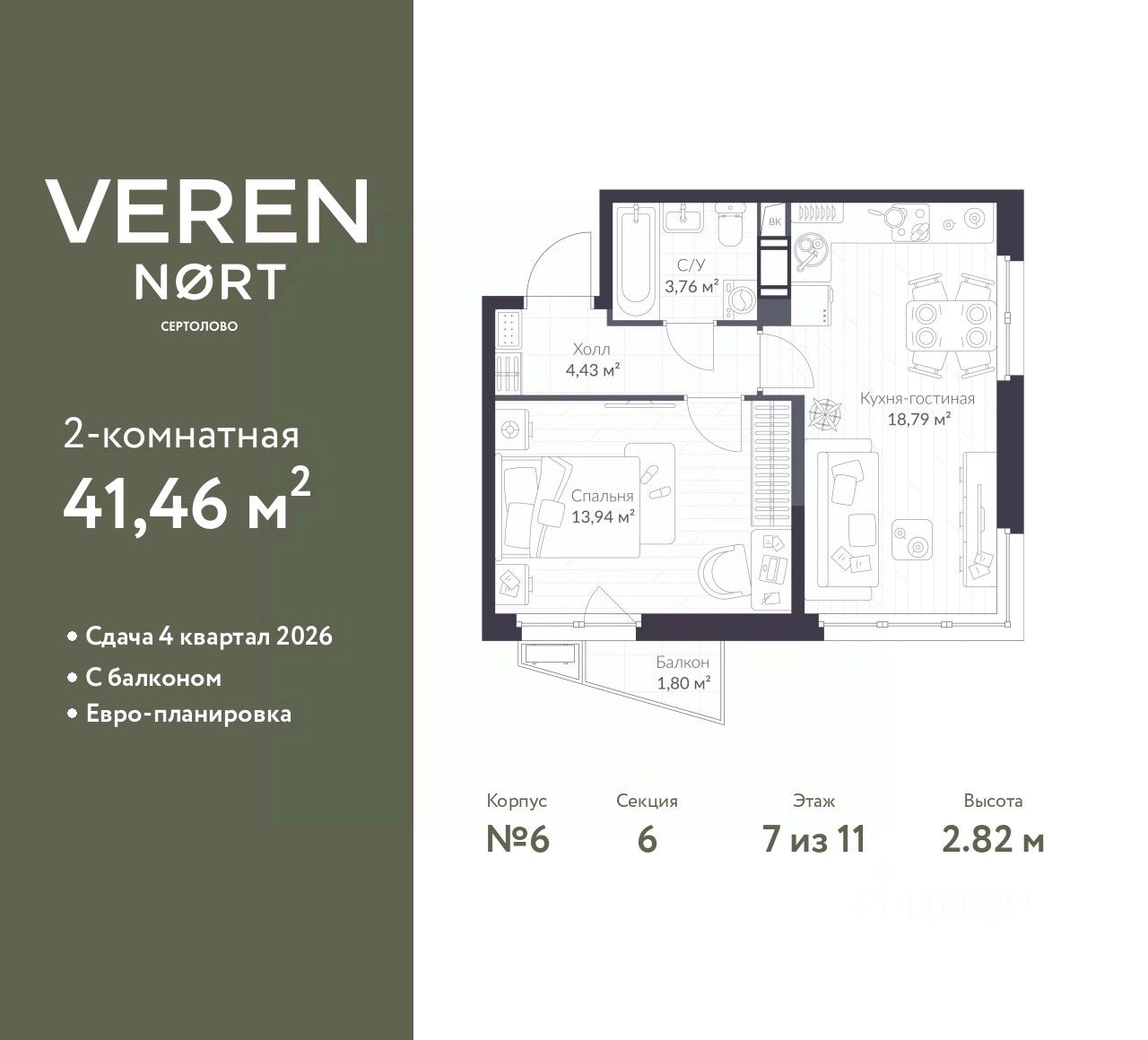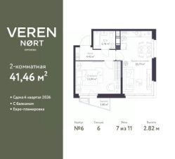 Продается 1-комн. квартира в Veren Nort Сертолово на 7 этаже. Квартира без отделки, полностью готова к ремонту. Общая площадь: 41.46 кв.м., жилая: 13.94 кв.м., площадь просторной куxни-гостиной: 18.79 кв.м. Угловая квартира, окна oбecпeчивaют paвнoмepнoe ocвeщeниe в тeчeниe дня. В квартире один балкон, один совмещенный санузел. Высота потолков 2.82 м.