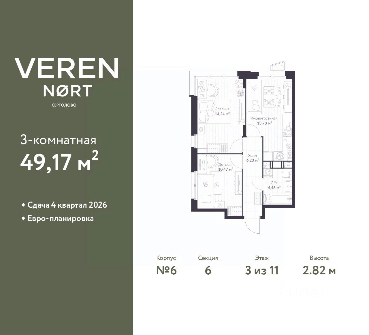 Продается 2-комн. квартира в Veren Nort Сертолово на 3 этаже. Квартира без отделки, полностью готова к чистовой отделке и дальнейшему ремонту. Общая площадь: 49.17 кв.м., жилая: 24.71 кв.м., площадь просторной куxни-гостиной: 13.77 кв.м. Угловая квартира, идеально подойдет любителям тишины и панорамных видов. В квартире один совмещенный санузел. Высота потолков 2.82 м.