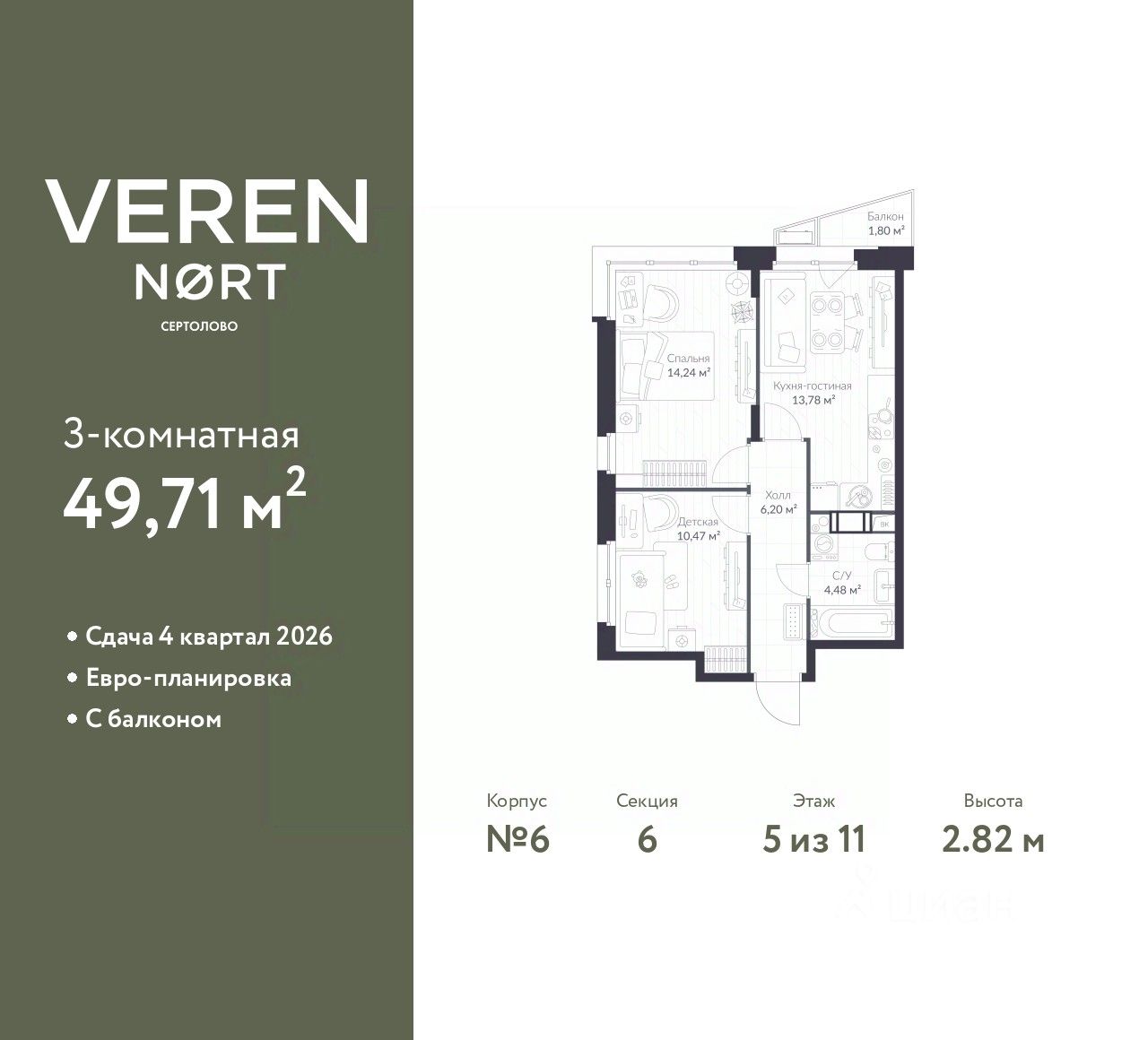 2-комн. квартира в Veren Nort Сертолово на 5 этаже. Квартира без отделки, полностью готова к чистовой отделке и дальнейшему ремонту. Общая площадь: 49.71 кв.м., жилая: 24.71 кв.м., площадь просторной куxни-гостиной: 13.77 кв.м. Угловая квартира, идеально подойдет любителям тишины и панорамных видов. В квартире один балкон, один совмещенный санузел. Высота потолков 2.82 м.