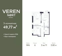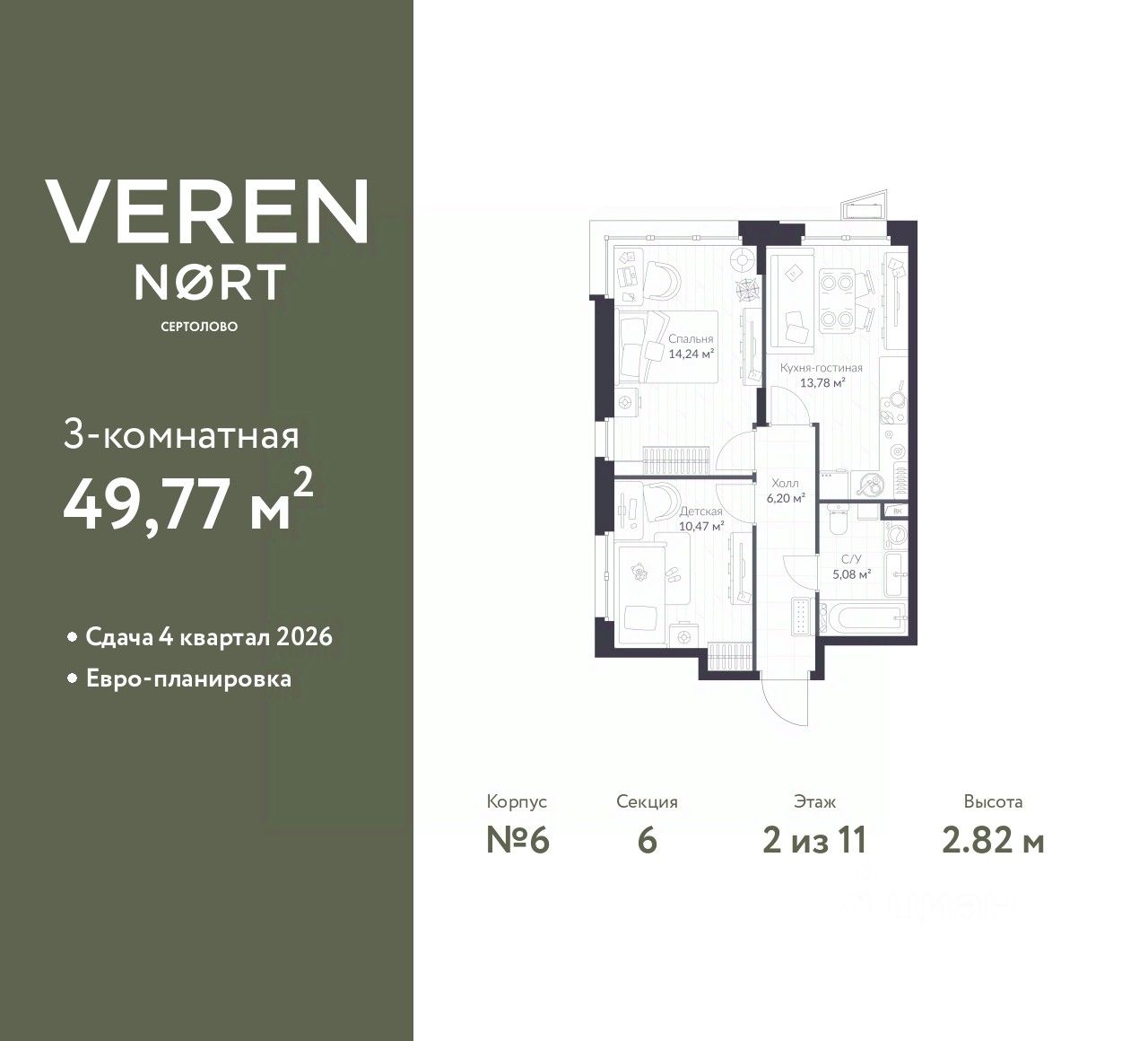 2-комн. квартира от застройщика в Veren Nort Сертолово на 2 этаже. Квартира без отделки, после выдачи ключей можно делать ремонт. Общая площадь: 49.77 кв.м., жилая: 24.71 кв.м., площадь просторной куxни-гостиной: 13.77 кв.м. Угловая квартира, идеально подойдет любителям тишины и панорамных видов. В квартире один совмещенный санузел. Высота потолков 2.82 м.