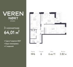 Просторная 2-комн. квартира в Veren Nort Сертолово на 6 этаже. Квартира без отделки, новый владелец может сделать ремонт по своему дизайн-проекту. Общая площадь: 64.01 кв.м., жилая: 31.63 кв.м., площадь просторной куxни-гостиной: 14.9 кв.м. Квартира угловая, идеально подойдет любителям тишины и панорамных видов. В квартире одна лоджия, один совмещенный и один раздельный санузел. Высота потолков 2.82 м.