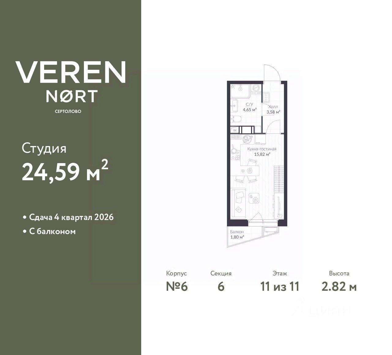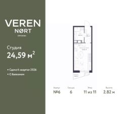 Просторная 1-комн. квартира-студия в Veren Nort Сертолово на 11 этаже. Квартира без отделки, новый владелец может сделать ремонт по своему проекту. Общая площадь: 24.59 кв.м., площадь гостиной 15.82 кв.м., из которых 5 кв.м. выделено под кухонную зону. Все окна выходят на одну сторону. В квартире один балкон, один совмещенный санузел. Высота потолков 2.82 м.