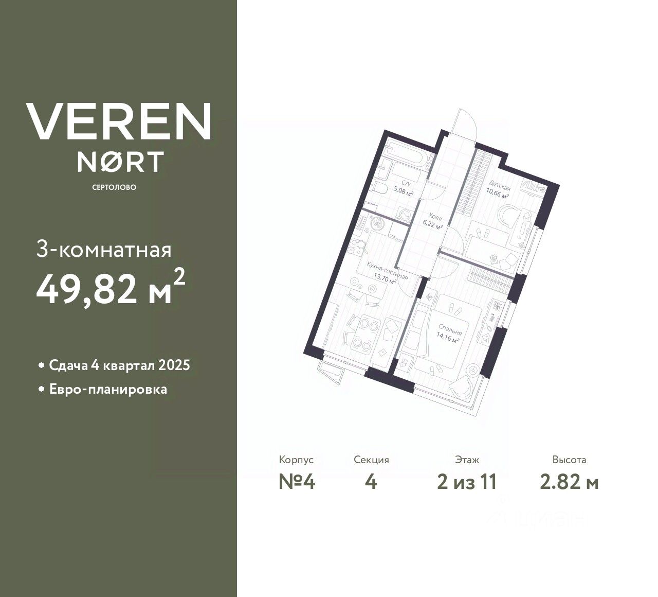 Продается 2-комн. квартира от застройщика в Veren Nort Сертолово на 2 этаже. Квартира без отделки, после выдачи ключей можно делать ремонт. Общая площадь: 49.82 кв.м., жилая: 24.82 кв.м., площадь просторной куxни-гостиной: 13.7 кв.м. Квартира угловая, окна oбecпeчивaют paвнoмepнoe ocвeщeниe в тeчeниe дня. В квартире один совмещенный санузел. Высота потолков 2.82 м.