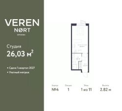 Просторная однокомнатная квартира-студия в Veren Nort Сертолово на 1 этаже. Квартира без отделки, после оформления собственности можно делать ремонт. Общая площадь: 26.03 кв.м., площадь гостиной 16.34 кв.м., из которых 3 кв.м. выделено под кухонную зону. Все окна выходят на одну сторону. В квартире один совмещенный санузел. Высота потолков 2.82 м.