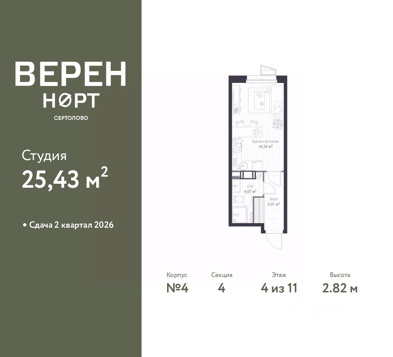 Однокомнатная квартира-студия от застройщика в ЖК "Верен Норт Сертолово" на 4 этаже. Квартира без отделки, новый владелец может сделать ремонт по индивидуальному проекту. Общая площадь: 25.43 кв.м., площадь гостиной 16.34 кв.м., из которых 3 кв.м. выделено под кухонную зону. Все окна выходят на одну сторону. В квартире один совмещенный санузел. Высота потолков 2.82 м.