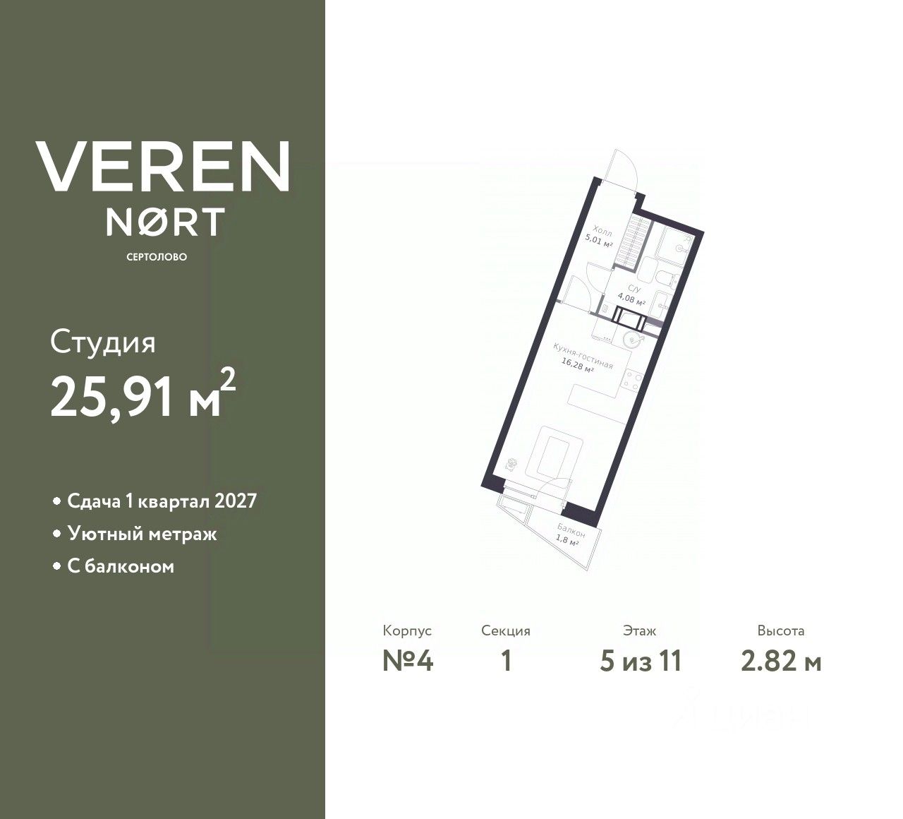 Просторная 1-комн. квартира-студия в Veren Nort Сертолово на 5 этаже. Квартира без отделки, после получения ключей можно делать ремонт. Общая площадь: 25.91 кв.м., площадь гостиной 16.28 кв.м., из которых 3 кв.м. выделено под кухонную зону. Все окна выходят на одну сторону. В квартире один балкон, один совмещенный санузел. Высота потолков 2.82 м.