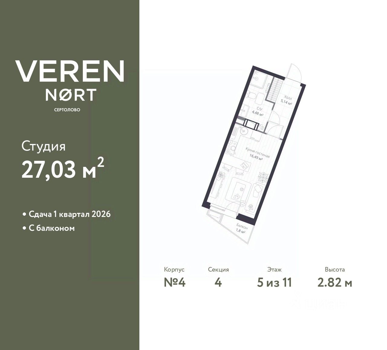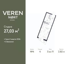 Однокомнатная квартира-студия от застройщика в ЖК "Верен Норт Сертолово" на 5 этаже. Квартира без отделки, после оформления собственности можно делать ремонт. Общая площадь: 27.03 кв.м., площадь гостиной 16.49 кв.м., из которых 3 кв.м. выделено под кухонную зону. Все окна выходят на одну сторону. В квартире один балкон, один совмещенный санузел. Высота потолков 2.82 м.