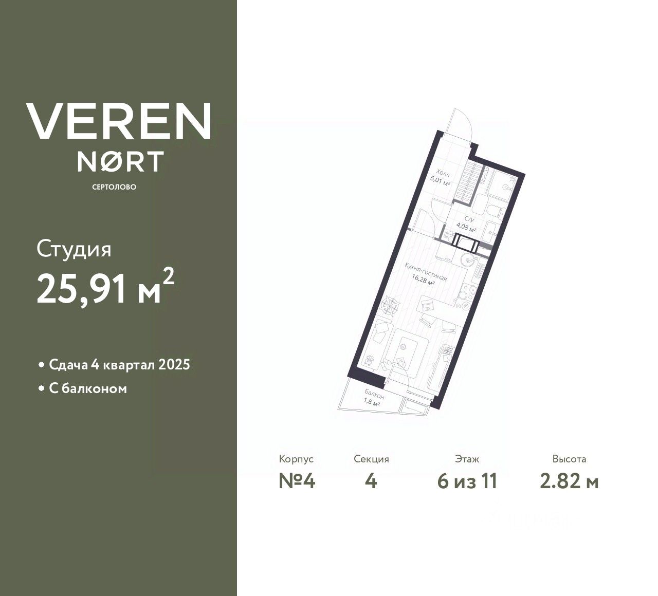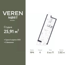 Однокомнатная квартира-студия в Veren Nort Сертолово на 6 этаже. Квартира без отделки, после оформления собственности можно делать ремонт. Общая площадь: 25.91 кв.м., площадь гостиной 16.28 кв.м., из которых 3 кв.м. выделено под кухонную зону. Все окна выходят на одну сторону. В квартире один балкон, один совмещенный санузел. Высота потолков 2.82 м.
